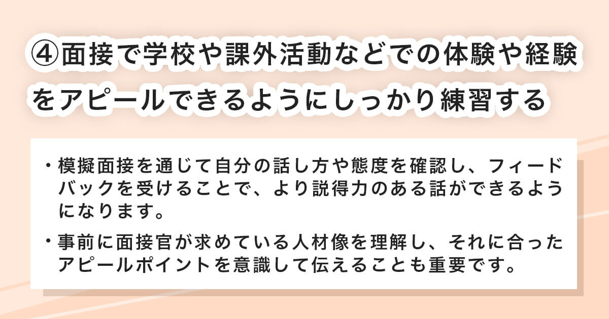 ④面接本番で学校や課外活動での体験や経験をアピールできるようにしっかり練習する